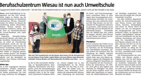 Wiesau. (wro) Federführend im Engagement, um den Titel Umweltschule tragen zu dürfen, war die Umweltbeauftragte am Beruflichen Schulzentrum Wiesau, Oberstudienrätin Ute Döhler. Im Namen der Schulleitung dankte Oberstudiendirektor Thomas Metzler. Der Schulleiter bedauerte jedoch, dass die Feier im Umweltministerium der Corona-Pandemie zum Opfer gefallen war.
