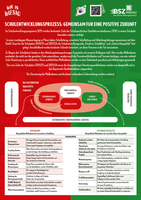 Getreu diesem Motto haben wir als QmbS-Team des BSZ Wiesau uns das Ziel gesetzt, das Schulleben zu erleichtern. Das QmbS-Team hat hierbei die Aufgabe, kritisches Denken anzuregen, Verbesserungsvorschläge zu sammeln und in Zusammenarbeit mit dem Kollegium die sich daraus ergebenden Qualitätsziele anhand von geeigneten Maßnahmen umzusetzen. Diese finden sich in unserem Schulentwicklungsprogramm (SEP) für das Schuljahr 2024/25 wieder.