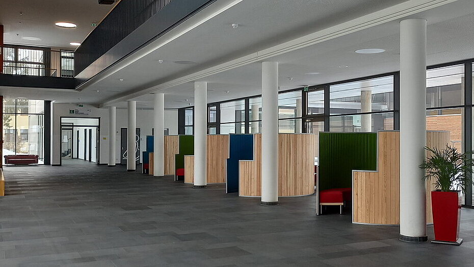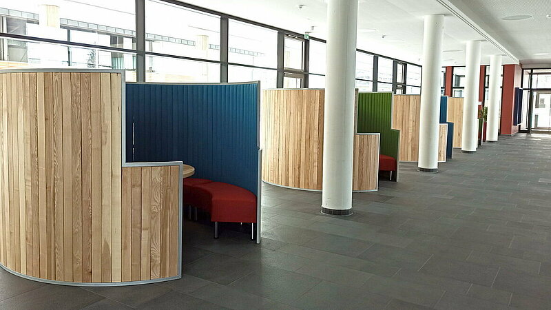 Schallgeschützt, farbenfroh und heimelig präsentieren sich die Einzelanfertigungen im neuen Atrium des Beruflichen Schulzentrums Wiesau. Sowohl in den Pausen als auch für Gruppenarbeiten sollen diese Think-Tanks intensiv genutzt werden.