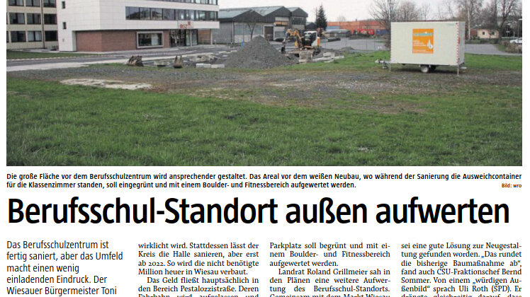 Die große Fläche vor dem Berufsschulzentrum wird ansprechender gestaltet. Das Areal vor dem weißen Neubau, wo während der Sanierung die Ausweichcontainer für die Klassenzimmer standen, soll eingegrünt und mit einem Boulder- und Fitnessbereich aufgewertet werden.