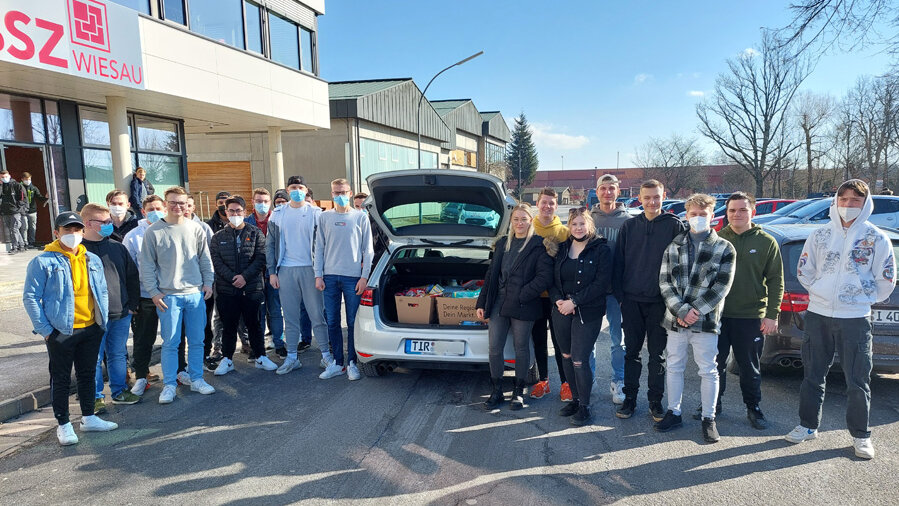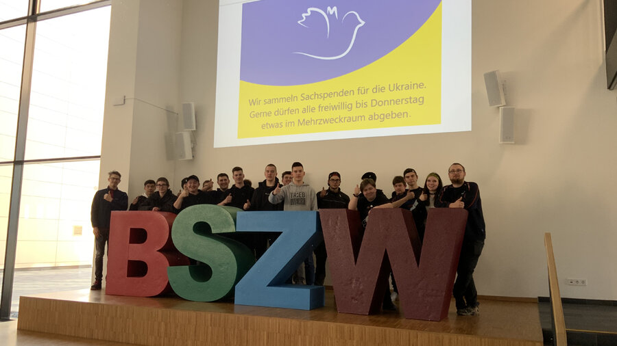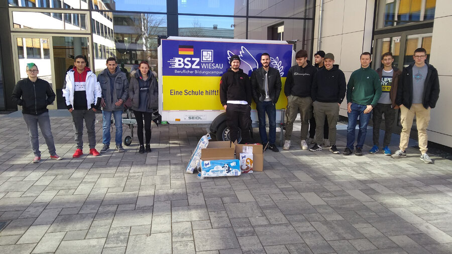An einer freiwilligen Sammelaktion für die Fahrt des Schulbusses in die Grenzregion Ukraine-Polen haben sich auch verschiedenste Klassen der gewerblichen Abteilung beteiligt. Die Schülerinnen und Schüler sammelten spontan in den Klassen eigenständig Geld ein und kauften im Anschluss daran gemeinsam im Supermarkt vor Ort die nötigsten Dinge ein. Bereits am ersten Sammeltag kamen mehrere Hundert Euro und damit einige Kofferräume voll Hilfsgüter zusammen.