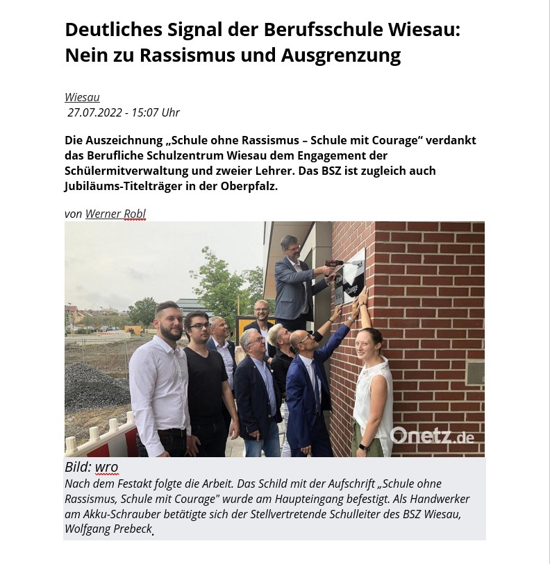 Die Auszeichnung „Schule ohne Rassismus – Schule mit Courage“ verdankt das Berufliche Schulzentrum Wiesau dem Engagement der Schülermitverwaltung und zweier Lehrer. Das BSZ ist zugleich auch Jubiläums-Titelträger in der Oberpfalz.