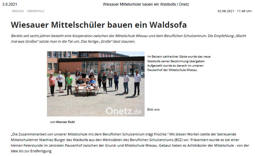 „Die Zusammenarbeit von unserer Mittelschule mit dem Berufl ichen Schulzentrum trägt Früchte.“ Mit diesen Worten stellte der betreuendeMittelschullehrer Matthias Burger das Waldsofa aus den Werkstätten des Berufl ichen Schulzentrums (BSZ) vor. Präsentiert wurde es bei einerkleinen Feierstunde im zentralen Pausenhof zwischen der Grund- und Mittelschule Wiesau. Gebaut haben es Achtklässler der Mittelschule - von derIdee bis zur Endfertigung.