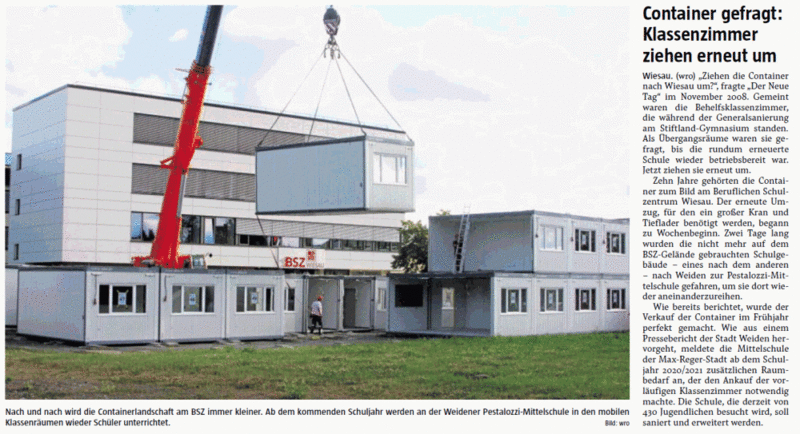 Nachdem im November 2019 der knapp 12 Millionen Euro umfassende Um- und Neubau insbesondere an der Berufsfachschule für Hotelmanagement und Tourismusmanagement die Ausbildungsqualität enorm verbessert und gerade die nagelneuen Fachräume in Küche, Restaurant, Hotelzimmer und Rezeption sowohl Ausbildung als auch Duales Studium auf höchstem Niveau ermöglichen, wurden endlich die nun vom Sachaufwandsträger verkauften mobilen Klassenzimmer vor dem Schulgebäude abgebaut. Fast 10 Jahre lang waren bis zu 6 Klassen u.a. der Tourismusschule Wiesau in den Containern untergebracht.