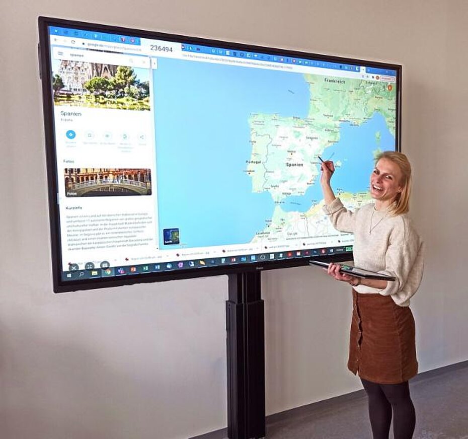 Über eine hohe staatliche Förderung konnten an der Berufsfachschule für Hotelmanagement und Tourismusmanagement Wiesau seit 09/20 über 69.000 EUR in die digitale Ausstattung investiert werden. Neben rund 50 Convertibles als Werkzeug im Unterricht wurden auch alle Klassenzimmer mit interaktiven Tafeln in Form von berührungsempfindlichen Monitoren mit 217cm Bilddiagonale ausgestattet. Alle digitalen Endgeräte lassen sich leicht - auch gleichzeitig - mit dem Fernseher verbinden, so dass kollaboratives und kreatives Arbeiten zur Leichtigkeit wird. Multimediale Inhalte sind jederzeit in hoher Qualität abruf- und darstellbar.